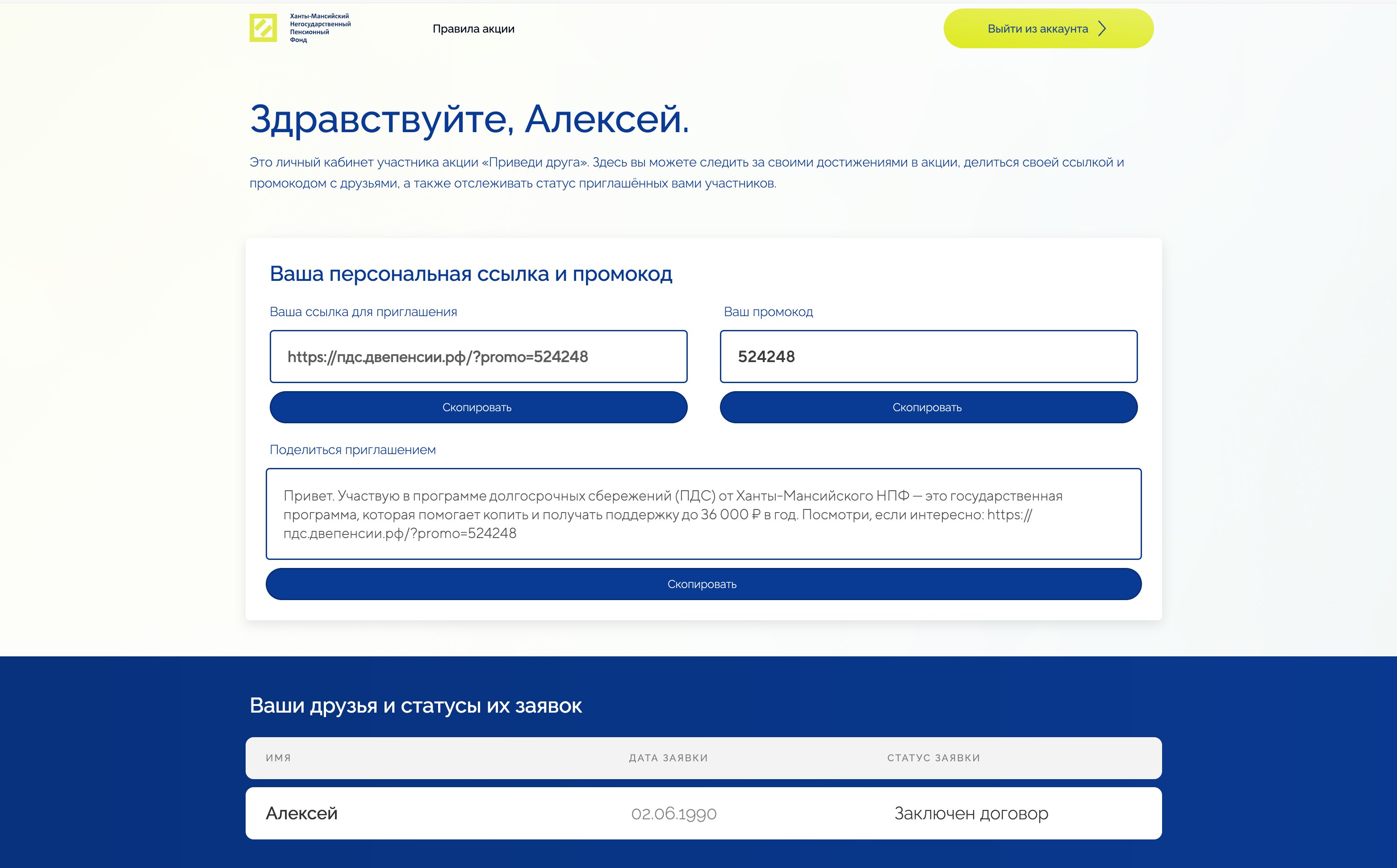 2. Перейти в личный кабинет акции, где вы получите свою уникальную ссылку и возможность отслеживать друзей, которые подали заявку и заключили договор. А также количество шансов на выигрыш главного приза.